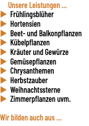 Unsere Leistungen ... u Frühlingsblüher u Hortensien u Beet- und Balkonpflanzen u Kübelpflanzen u Kräuter und Gewürze u Gemüsepflanzen u Chrysanthemen u Herbstzauber u Weihnachtssterne u Zimmerpflanzen uvm. Wir bilden auch aus ...